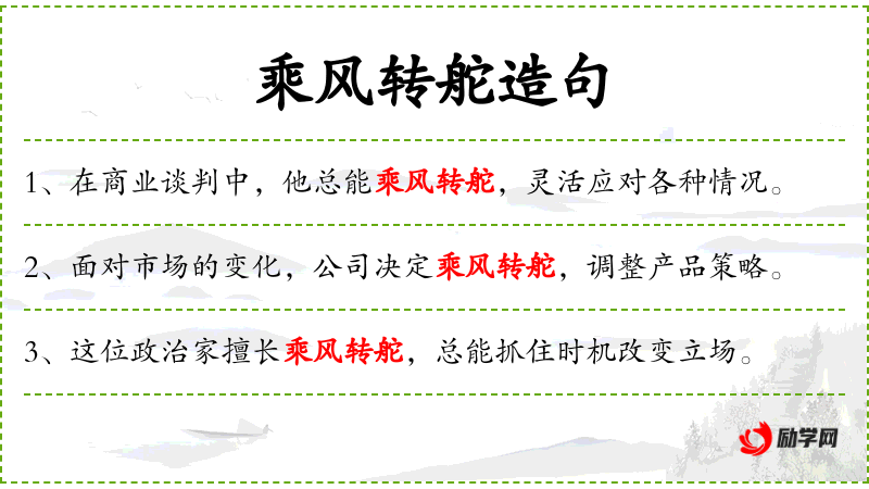 “乘风转舵”是一个成语,源自古代航海术语,比喻在复杂多变的环境中能够灵活应对。这个成语体现了文化中对智慧和应变能力的重视。