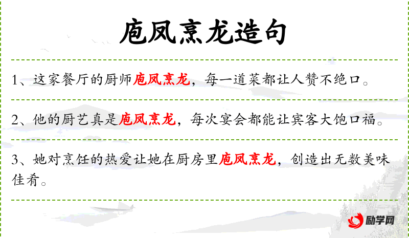 - 庖凤烹龙:成语,形容烹饪技艺高超。