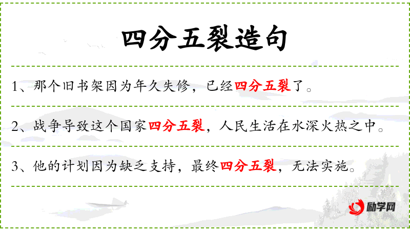 - 四分五裂:形容物体破碎成很多块。
