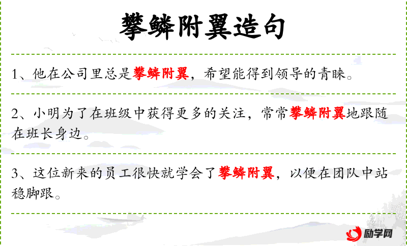 - 攀鳞附翼:成语,比喻依附有权势的人以自抬身价。