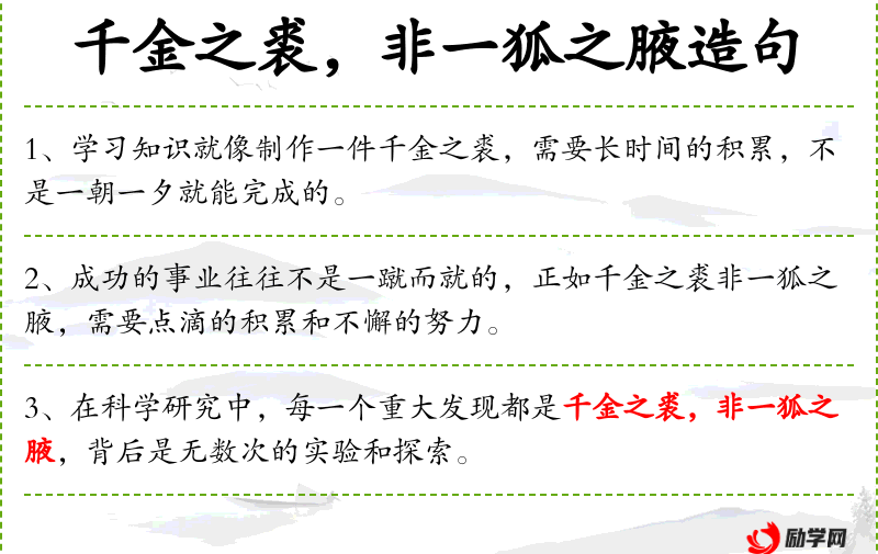 句子中使用了成语“千金之裘,非一狐之腋”,这个成语源自**古代,强调珍贵事物的难得和复杂性。了解这个成语的背景有助于更深层次地理解句子的文化内涵。