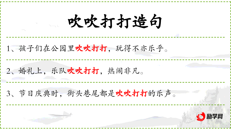 - 吹吹打打:形容孩子们在户外玩耍的声音和动作,状语。