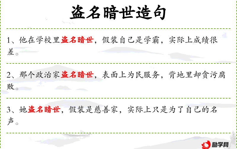 1. 【盗名暗世】 - 盗:窃取;名:名誉、名称;暗:黑暗。在黑暗时代窃取好的名誉。指奸佞之人在乱世乘机骗取声誉。