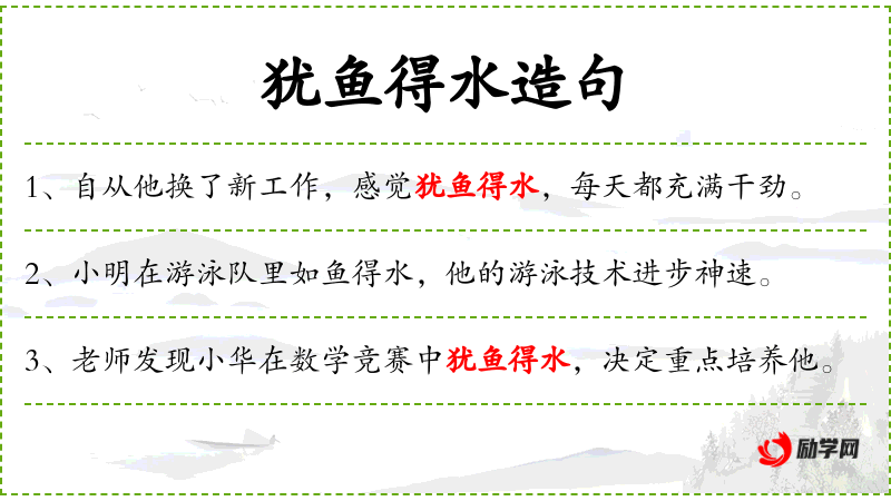 2. 【犹鱼得水】 - 好像鱼得到水一样。比喻有所凭借。也比喻得到跟自己十分投合的人或对自己很合适的环境。