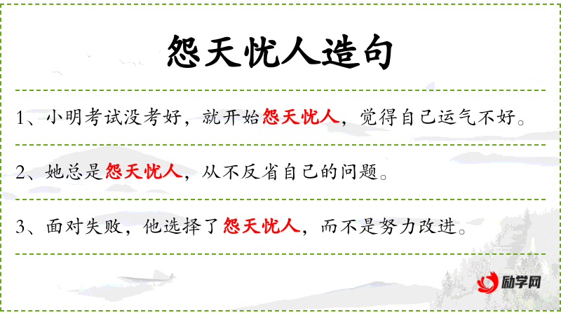 - 怨天忧人:抱怨命运或他人,表示消极的应对方式。