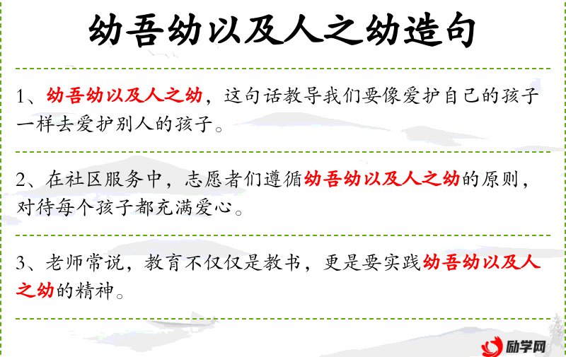 - 幼吾幼以及人之幼:成语,源自《孟子·梁惠王上》,意为关心自己的孩子,也要关心别人的孩子。