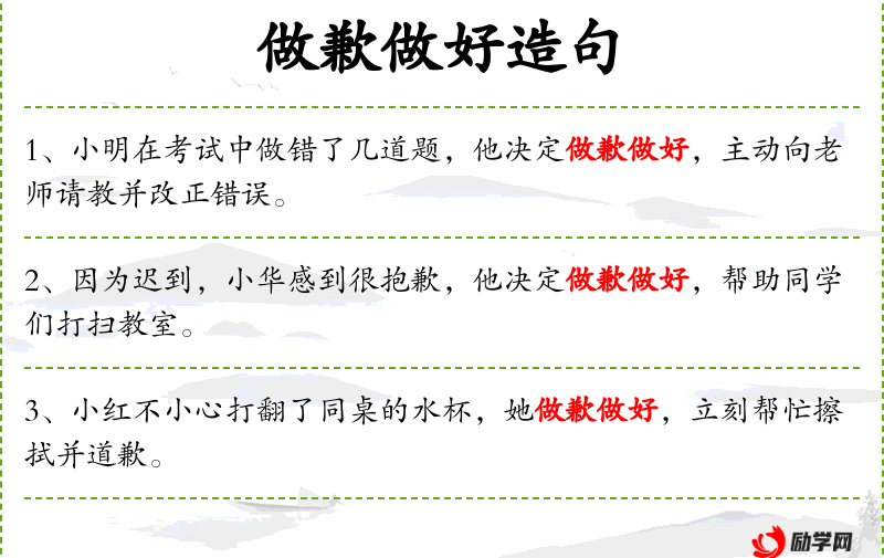 在实际交流中,这个句子可能用于描述一个具体**,或者作为一种教育方式,强调责任感和社会规范。使用“做歉”和“重新打扫”显示了礼貌和自我修正的态度。