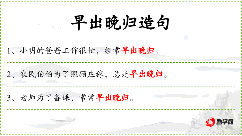 - 早出晚归:形容非常勤奋,早上很早出门,晚上很晚回家。