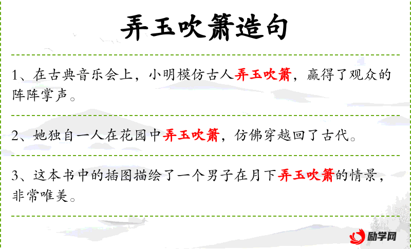 “弄玉吹箫”源自古代,是一种结合了音乐和舞蹈的艺术形式。这个成语可能源自古代的神话故事,如《列子·汤问》中的“弄玉吹箫,引凤来仪”。这个句子反映了对传统文化的尊重和传承。