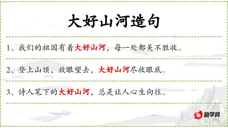 - 主语:“大好山河的美景”,由名词短语构成,其中“大好山河”是定语,修饰“美景”。
