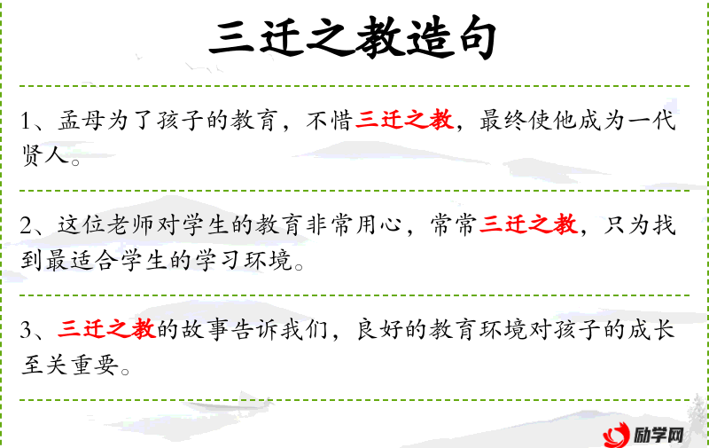 句子中的“三迁之教”源自孟母三迁的典故,反映了传统文化中对教育的重视和家长为了孩子教育所做的牺牲。这个成语在文化中常被用来赞扬那些为了孩子教育不惜一切代价的家长。