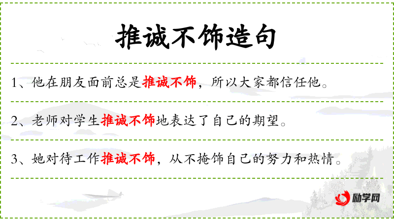 - 推诚不饰:成语,意为坦率、真诚,不加掩饰。