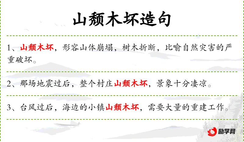 - 山颓木坏:形容山体崩塌,树木损坏的景象。
