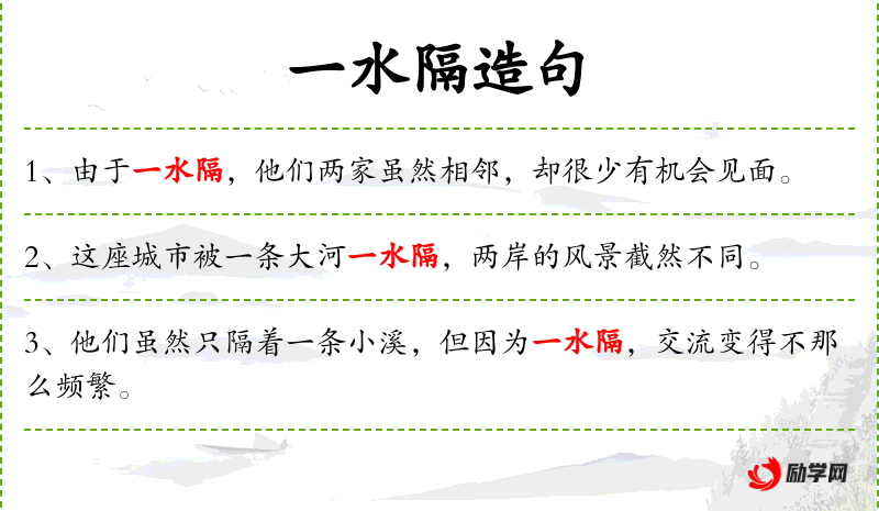 1. 【一水隔】 - 受一条河水的阻隔。比喻双方因受水路交通不便而很少会面。