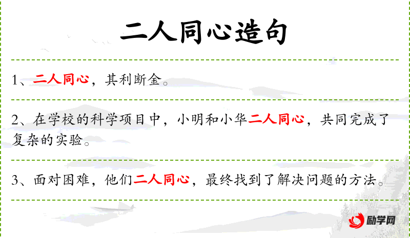 - 二人同心:表示两个人或多人共同努力,心意一致。