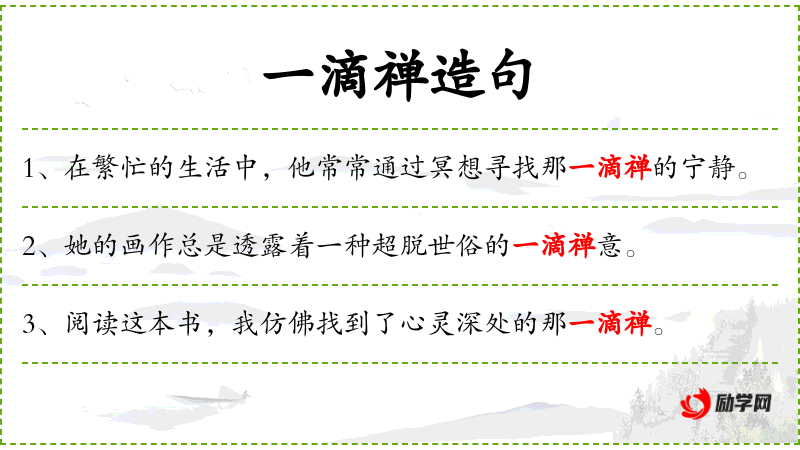 1. 【一滴禅】 佛教禅宗谓从一句﹑一事﹑一境中触机悟道。语本宋本觉《释氏通鉴·韶国师》"问'如何是曹溪一滴水?'眼曰'是曹溪一滴水。'韶闻乃大悟,平生疑滞,涣若冰释。"