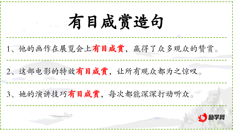 1. 【有目咸赏】 咸:都;赏:称赞。谁看见了都称赞。