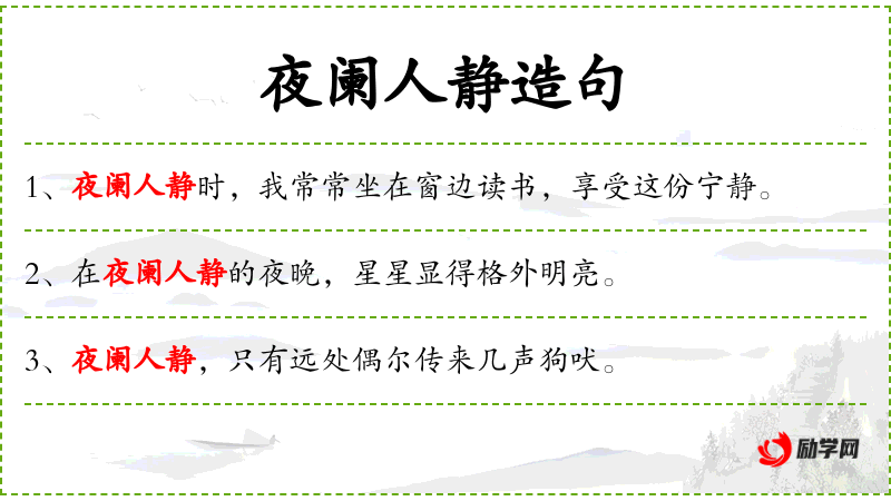 - 夜阑人静:形容夜晚非常安静,人们都已入睡。