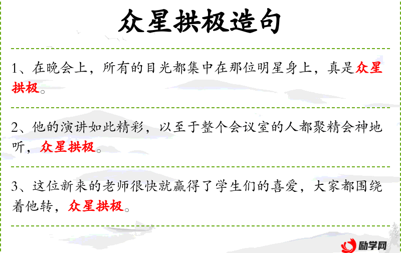 - 众星拱极:这个成语源自**古代天文学,比喻众人围绕中心人物,表示尊敬和追随。