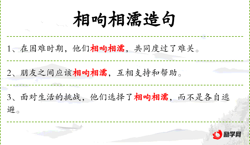 3. 【相呴相濡】 - 呴:吐口水;濡:沾湿。原指泉水干竭,鱼儿互相吐口水以沾湿求生。后比喻处于困境之中,互相竭力救助。