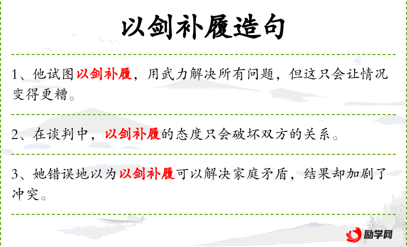 - 以剑补履:比喻用不适当的方法来解决问题,通常指用暴力或强硬手段来处理问题。