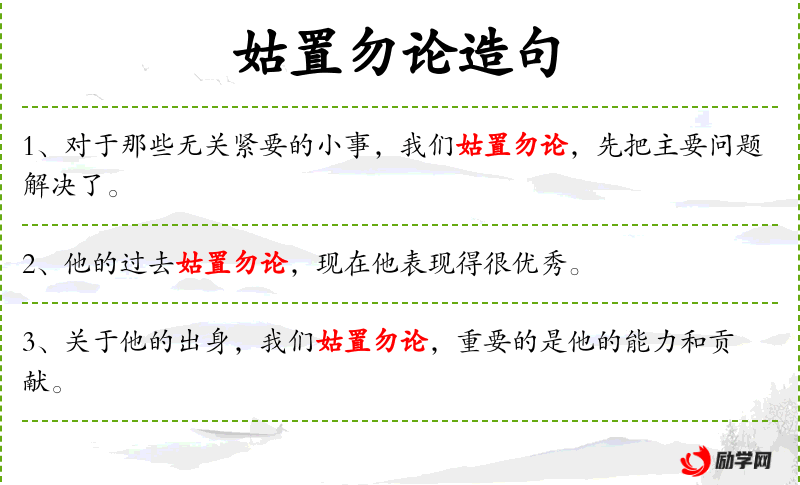 - 姑置勿论:暂时不讨论或不考虑。