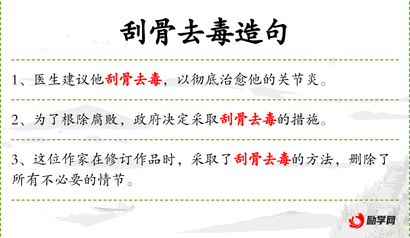 “刮骨去毒”这个成语源自古代医学,后来被引申为彻底解决问题的方法。在这里,它被用来形容一种彻底的、不留后患的改革方式,体现了文化中对于彻底性和决心的重视。