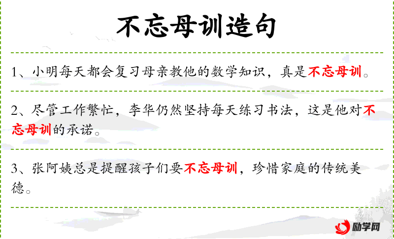 1. 【不忘母训】 指不忘记母亲的教诲。