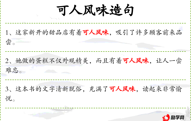 - 可人风味:形容词短语,表示令人喜爱或愉悦的特质。