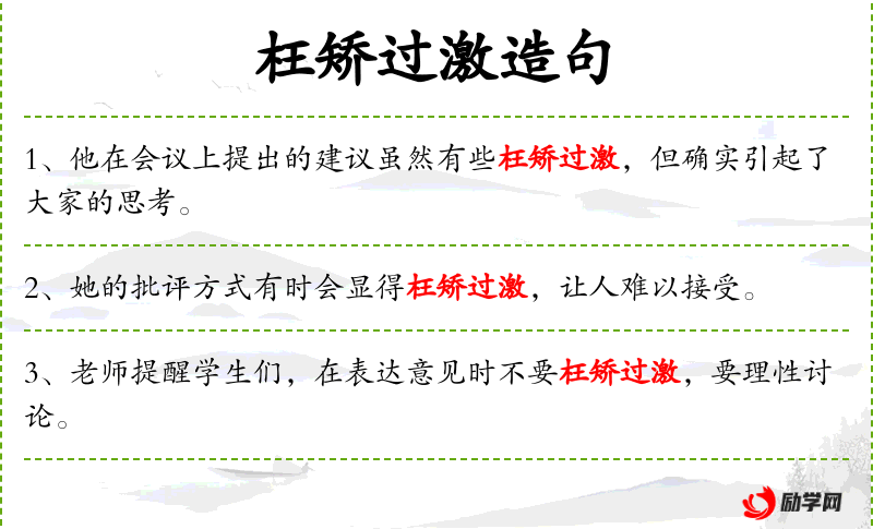 3. 【枉矫过激】 - 犹言矫枉过正。比喻纠正错误超过了应有的限度。