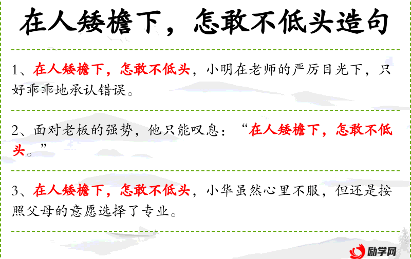 - 在人矮檐下,怎敢不低头:这是一个成语,意思是处于弱势或不利地位时,不得不屈服或顺从。