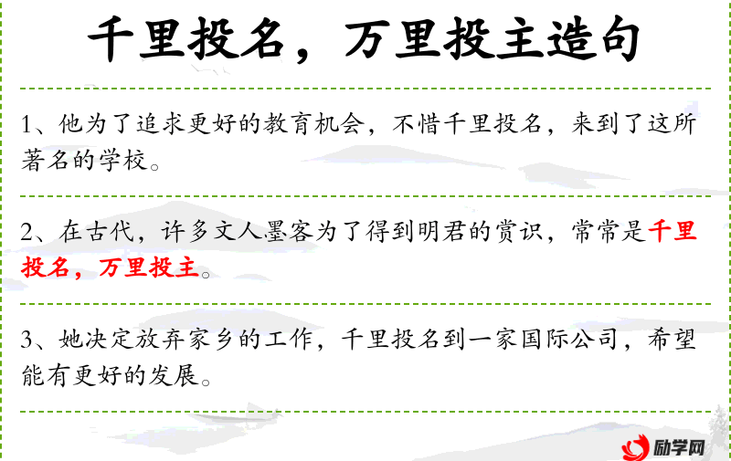 - 成语:“千里投名”可以联想到成语“千里迢迢”,都表示距离遥远。