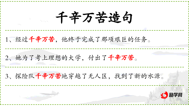 - 千辛万苦:形容非常辛苦和艰难。