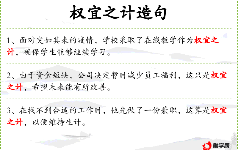 3. 【权宜之计】 权宜:暂时适宜,变通;计:计划,办法。指为了应付某种情况而暂时采取的办法。