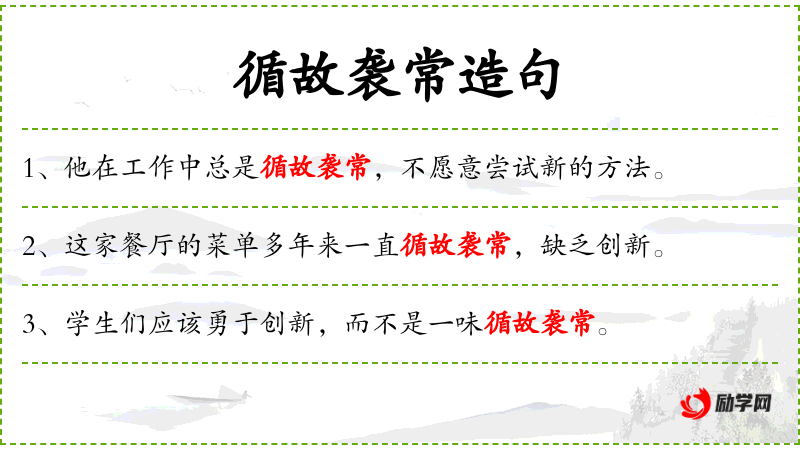 - 循故袭常:遵循旧有的习惯或方法,不进行创新。