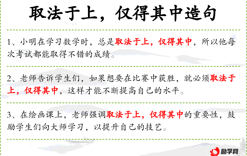- 相关成语:“取法乎上,仅得其中”是该成语的完整形式,强调即使目标很高,实际成果可能只是中等。