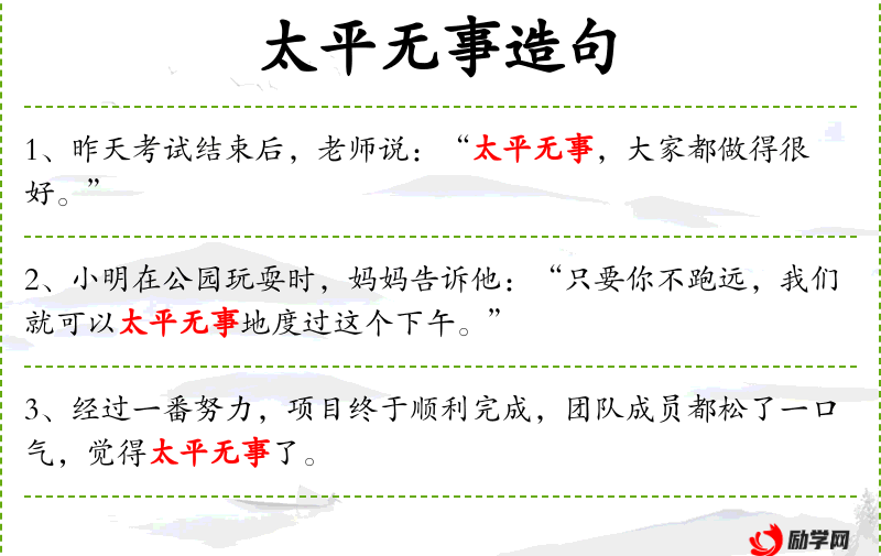 - 太平无事:形容生活安宁,没有麻烦或危险。