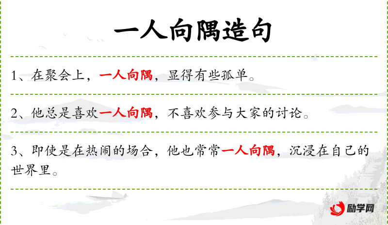 - 一人向隅:这个短语可能源自**传统文化,表示一个人独自躲在角落,不愿与人交流。