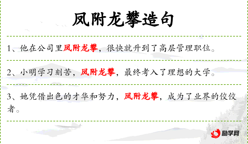 - 凤附龙攀:这个成语源自**传统文化,凤和龙分别代表女性和男性的最高象征,依附于他们意味着依附于最高权力。