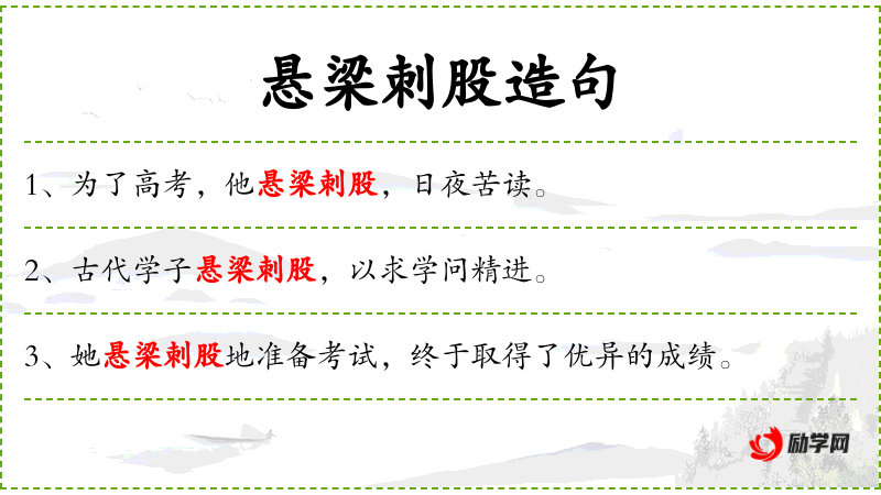 - 悬梁刺股:这是一个成语,源自*古代的故事,形容刻苦学的精神。
