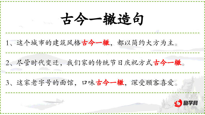 - 古今一辙:形容无论古今,风格或方法都一样。