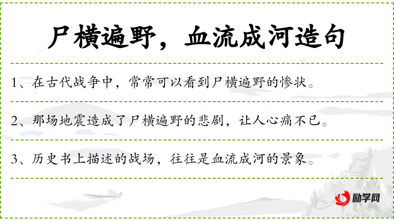 - 尸横遍野:形容死伤惨重,尸体遍布各处,是一个成语。