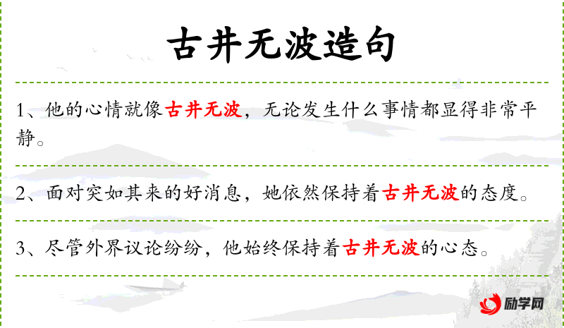 - 古井无波:这个成语源自传统文化,比喻心境平静,不受外界干扰。它反映了人追求内心平和和情绪稳定的文化价值观。