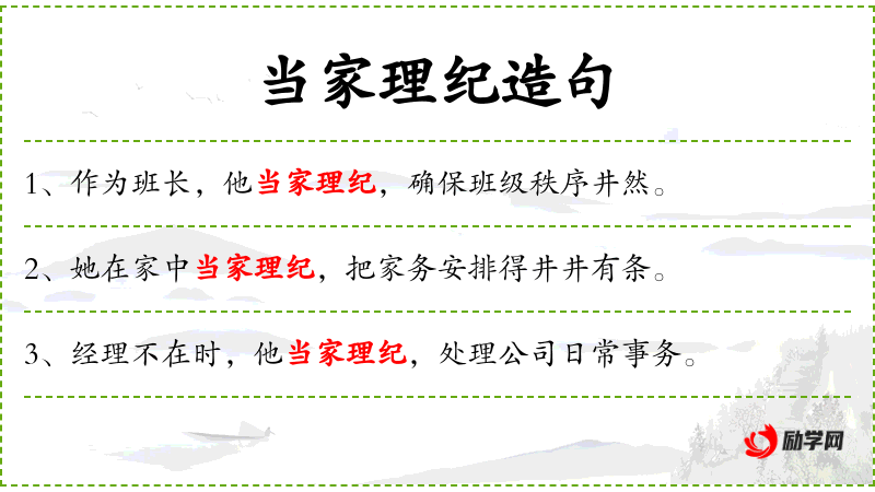 - 当家理纪:这个成语源自**传统文化,强调管理家务的重要性,这里引申为管理课堂纪律。