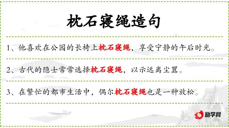 4. 【枕石寝绳】 - 枕方石,睡绳床。同“枕方寝绳”。