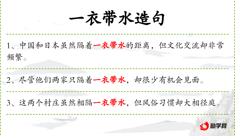 1. 【一衣带水】 - 一条衣带那样狭窄的水。指虽有江河湖海相隔,但距离不远,不足以成为交往的阻碍。