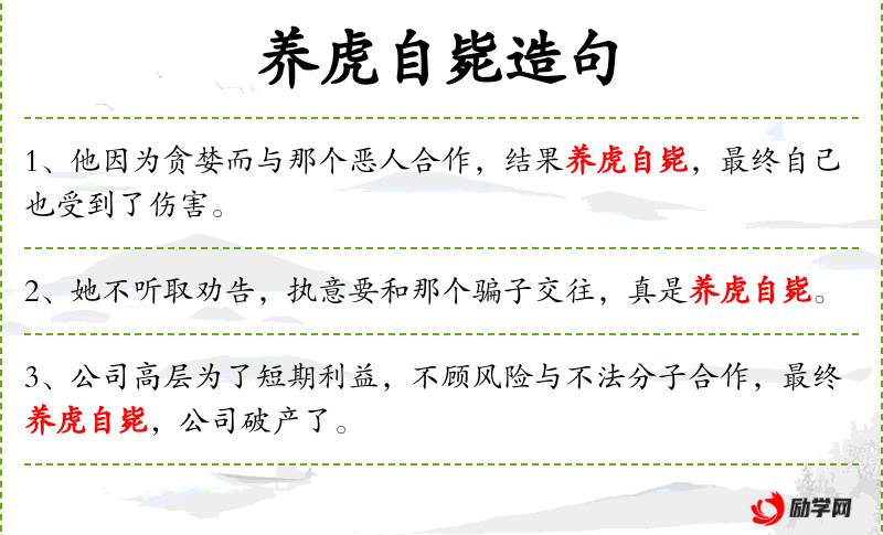 - 养虎自毙:这个成语源自**古代,比喻自招祸害,自食其果。