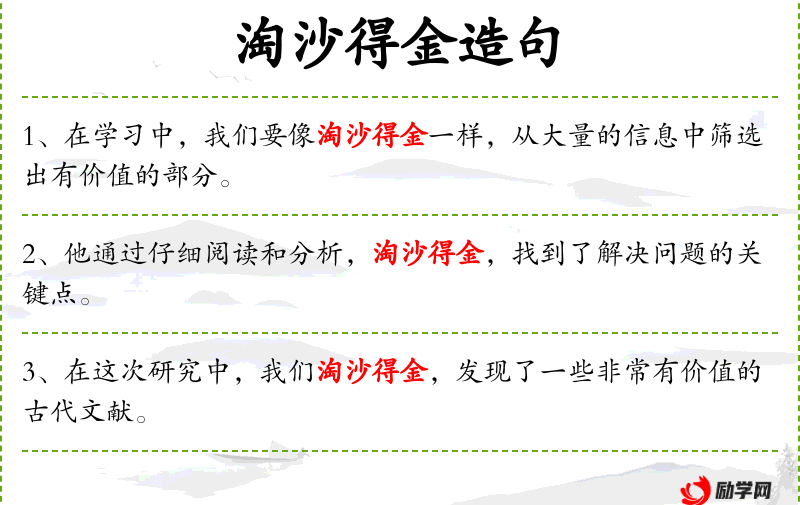4. 【淘沙得金】 - 用水选的方法从沙子里取得真金。比喻除去杂质,提取精华。也比喻费力大而成效少。