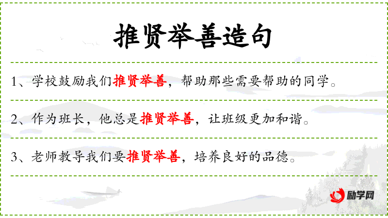 - 推贤举善:推荐贤能之人,提倡善良行为。