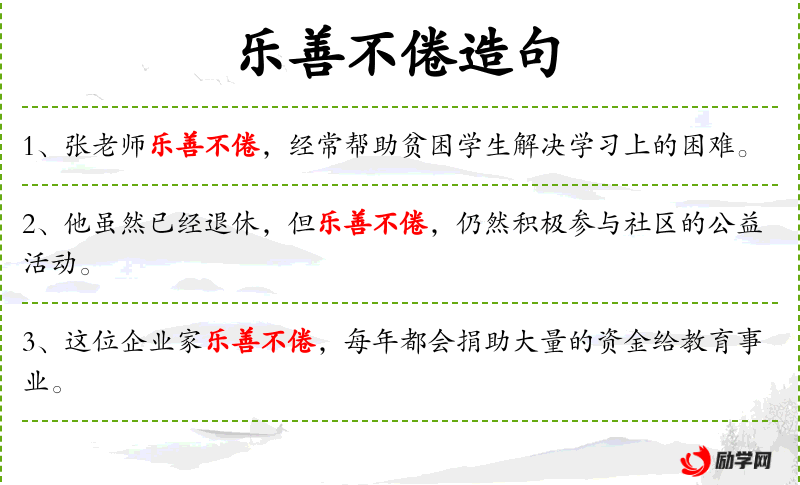 - 谓语:“乐善不倦”,描述了主语的行为特征,即持续不断地做好事。